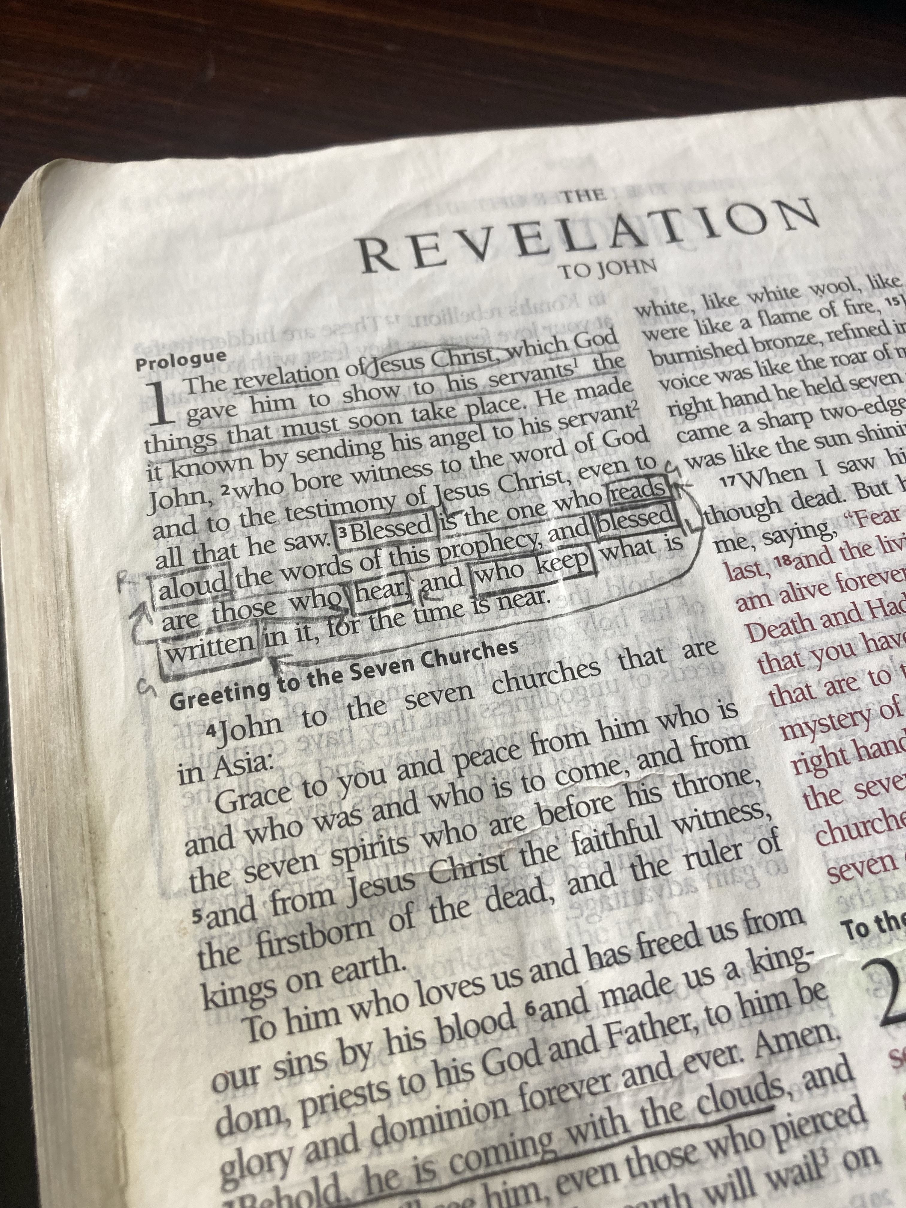 “3Blessed is the one who reads aloud the words of this prophecy, and blessed are those who hear, and who keep what is written in it, for the time is near.” – Rev 1:3