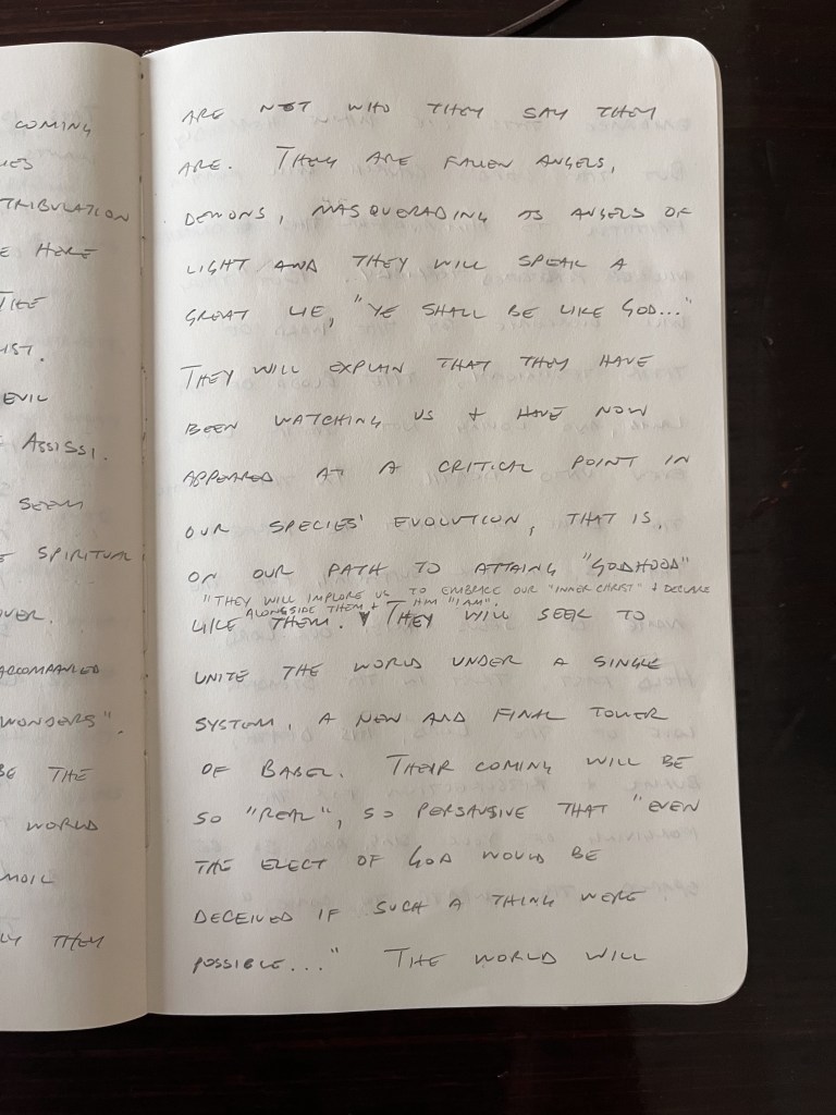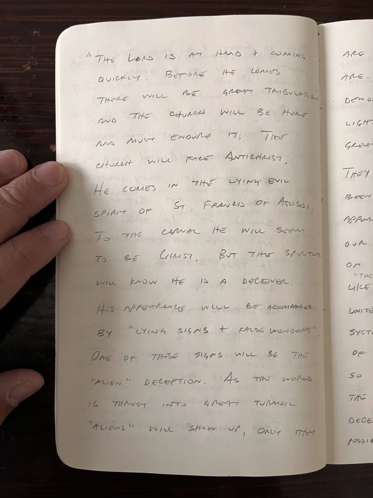 The Lord is at hand and coming quickly. Before he comes there will be great tribulation and the church will be here and must endure it. The church will face Antichrist. He comes in the lying evil spirit of St. Francis of Assisi. To the carnal he will seem to be Christ. But the spiritual will know he is a deceiver. His appearance will be accompanied by “lying signs and false wonders”. One of these signs will be the “alien” deception. As the world is thrust into great turmoil “aliens” will show up, only they are not who they say they are. They are fallen angels, demons, masquerading as angels of light and they will speak a great lie, “ye shall be like God…” They will explain that they have been watching us and have now appeared at a critical point in our species’ evolution, that is, on our path to attaining “godhood” like them. They will implore us to embrace our “inner christ” and declare alongside them and him, “I AM”. They will seek to unite the world under a single system, a new and final Tower of Babel. Their coming will be so “real”, so persuasive that “even the elect of God would be deceived if such a thing were possible…” The world will embrace this lie whole heartedly. But the Lord’s church will remain faithful to Him and for this the church will be persecuted terribly. But “they will overcome by the word of their testimony, the blood of the Lamb and loving not their lives even unto death.” In this, shall the Bride of Christ be perfected, that is, in her suffering for the name of Jesus Christ our Lord. Hold fast, trust in the steadfast love of the Lord, his death, burial, and resurrection for the forgiving of your sins and so be spared the wrath to come.