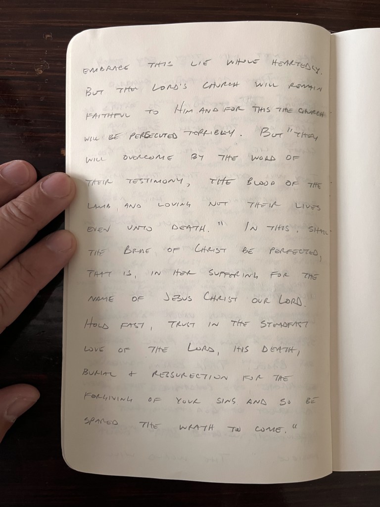 So later that day I felt compelled to just write down with pencil and paper what it was I believed the Lord wanted me to share with his church. I wrote it down because I wanted there to be a crystal clear record of what I believed he was having me share. I didn’t want to come back and forget the exact nature of the word and then have it morph into something else over time.
